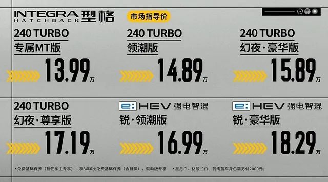型格HATCHBACK共计推出6种配置,其中MT手动挡版本官方售价13.99万,CVT版本官方售价在14.89-17.19万,而e:HEV版本官方售价则在16.99-18.29万。可见,给到市场的选择还是比较多的。